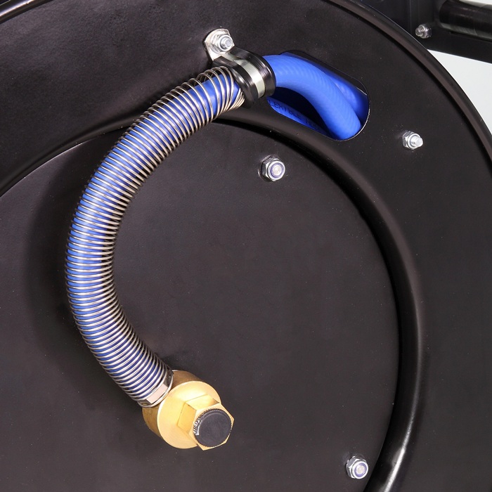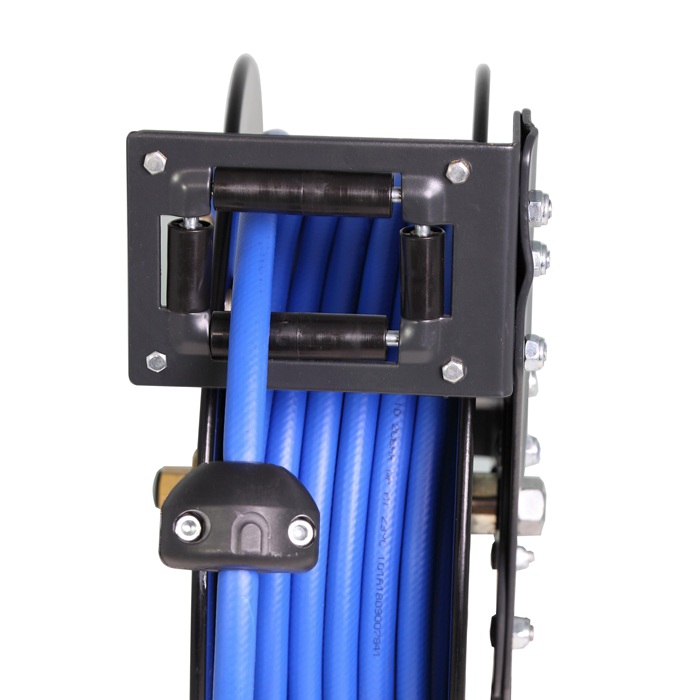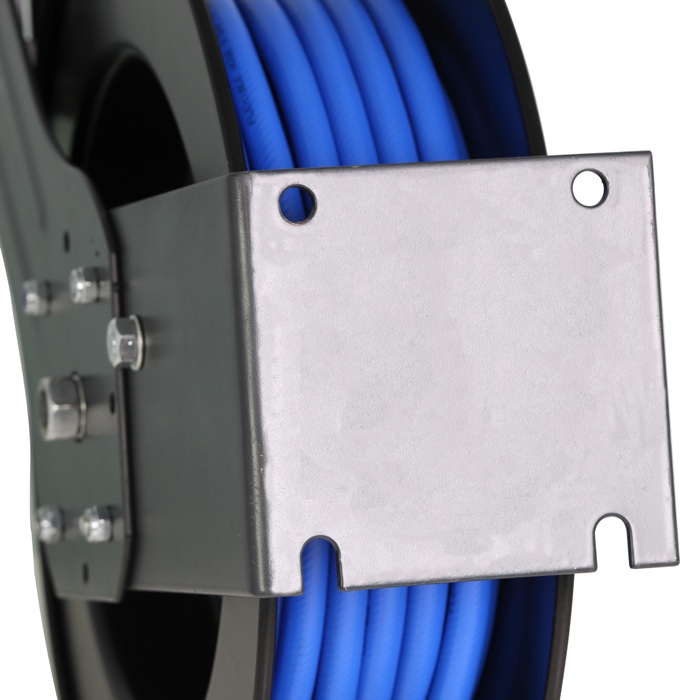 mit Schlauchführung - für ein sauberes Aufrollen des Schlauches · stabiles Stahlblechgehäuse, pulverbeschichtet · Gehäuse schützt den Druckluftschlauch vor Verschleiß · stabile Wandhalterung · mit hochflexiblem PU- Gewebe-Schlauch · Arretierung verhindert den ungewollten automatischen Rücklauf · fertig montiert und sofort einsatzfähig