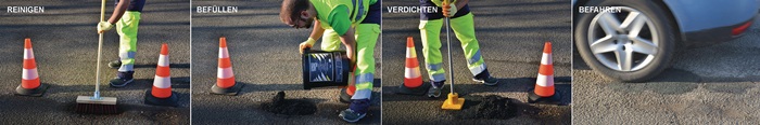 gebrauchsfertiger, ein-komponenten Kaltasphalt · für eine leichte Reparatur von Asphaltflächen · sofort einsatzbereit, kein Primer oder Vorbehandlung nötig · für eine einfache, saubere und kostengünstige Instandsetzung · ideal für Parkplätze, Frost- und Schlaglochschäden, Verkehrsflächen, Gehwege, Spielplätze, Garagenzufahrten, Sanierungen und Deckenanschlüsse · für fast alle Untergründe, drinnen wie draußen (Beton, Asphalt, Bitumen, Teer und mehr) · auch für feuchte Untergründe · sofort verkehrstauglich nach Befüllung · besteht Frost-Tau-Zyklen und ist schneeräumungs- sowie tausalzbeständig · ganzjährig einsetzbar, bei jedem Wetter und zu jeder Jahreszeit