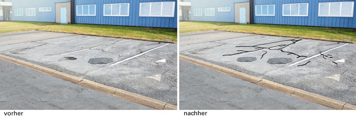 Profi-Reparaturkit · perfekt für Straßen, Parkplätze und Industrieböden · sorgt für eine schnelle und zuverlässige Reparatur von Rissen und Fugen · verschließt und versiegelt Risse in Asphalt- und Betonflächen · verhindert Wasserschäden und Auswaschungen · einfache Anwendung, unkompliziert und effizient in der Handhabung · Mischungsverhältnis: 6 kg Asphalt Crack Filler mit 1 Liter Wasser vermengen, je nach Rissart die Wassermenge ggf. anpassen · Boden vorher grob reinigen, um eine optimale Haftung zu gewährleisten