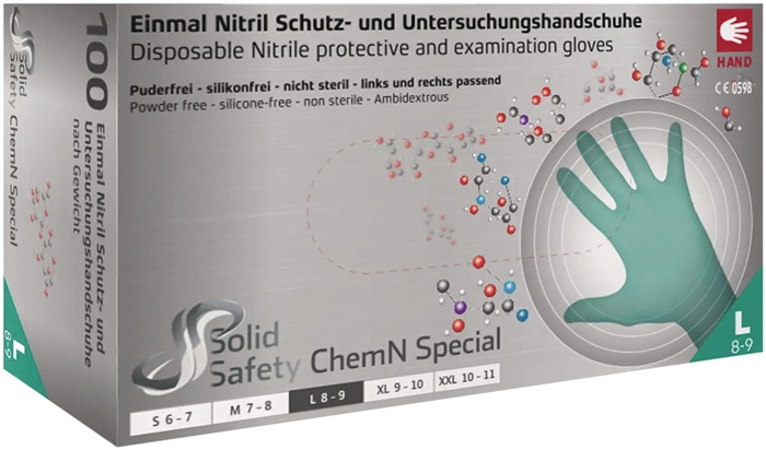 nach EN 21420 · EN 455 · EN 374 · Kat. III · AQL 0,65 · Material: Nitril · sehr gute chemische und physikalische Beständigkeit · nachgewiesene Beständigkeit gegenüber Mikroorganismen · silikonfrei · weiche, angenehme Passform · lebensmittelgeeignet · ausgezeichneter Tragekomfort · sehr gute Griffigkeit auch bei Nutzung in feuchten oder nassen Einsatzbereichen · unsteril und puderfrei Box à 100 St.