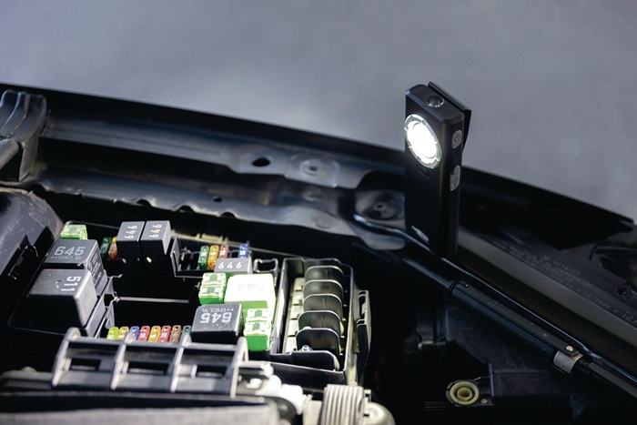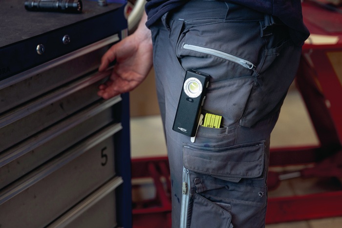 kompakte Bauform mit IPX6 und IK07 · Distanzsensor für einfache Bedienung · integrierte Haltemagnete und Gürtelclip · Leuchtweite bis zu 55 m, Leuchtdauer bis zu 10 h · 3 Helligkeitsstufen wählbar · Zusatzlicht an der Kopfseite · integrierter Li- Ion Akkupack mit Sicherheitselektronik