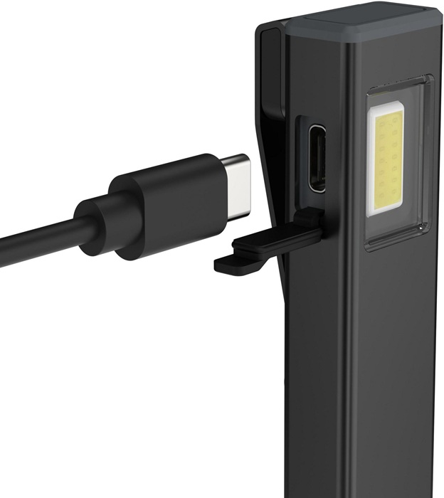 wiederaufladbare handliche Profi-Stiftleuchte · erzeugt eine Helligkeit von bis zu 500 lm durch den Einsatz der COB-LED Technologie · die Leuchte kann mittels Knopfdruck in drei Helligkeitsstufen eingestellt werden · kurzzeitig Boost-Funktion möglich · Fixierung der Leuchte durch Magente auf der Rück- und Unterseite · Leuchtdauer bis zu 3h · Aufladung erfolgt über das mitgelieferte USB Type-C-Ladekabel