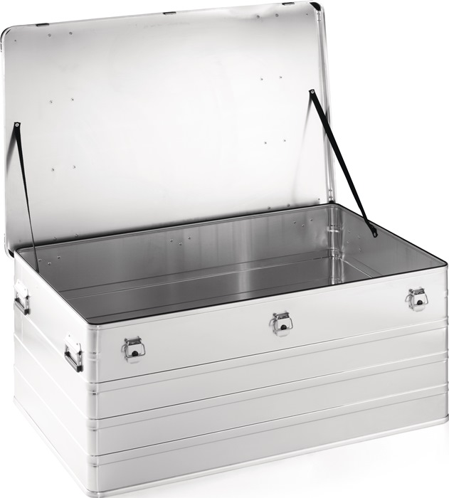 sehr robuste Transportboxen aus 1 mm starkem Aluminiumblech · leicht, stabil und formbeständig durch umlaufende Sicken · korrosions-, witterungs- und temperaturbeständig · 4 robuste Stapelecken aus Nylon/Polyester zum sicheren und platzsparenden Stapeln · umlaufende Gummidichtung im Kastenprofil zum Schutz vor Staub und Wasser · zwei Fangbänder am Deckel verhindern ein Ausreißen der Scharniere · bei den Ausführungen 9000 447 966 und 9000 447 968 sind Boden und Deckel zusätzlich mit Aluprofilen verstärkt · selbsteinklappende Sicherheitshandgriffe, kunststoffummantelt für bequemenTransport · stabile Klapphebelverschlüsse mit Bohrungen für Vorhängeschloss · vorbereitet für die Montage von Zylinderschlössern