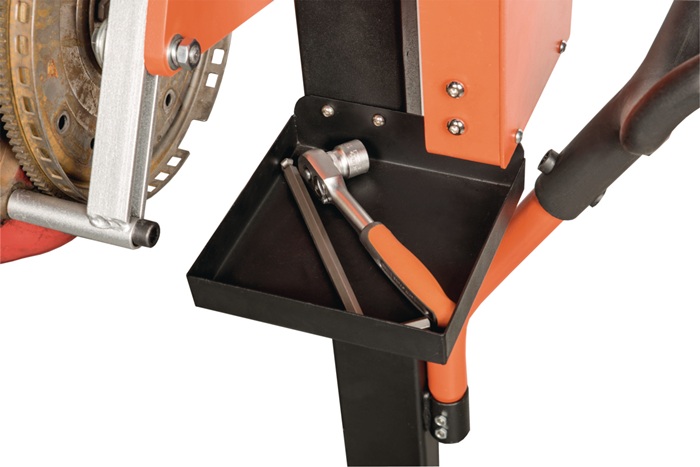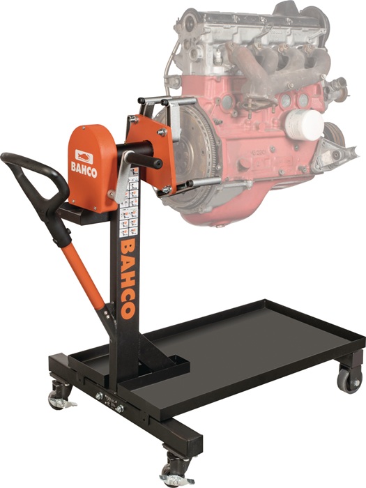 konzipiert für eine einfache Motorwartung · max. Traglast 500 kg hält eine Vielzahl an Motoren · Übersetzungsverhältnis 70:1 · Rotationssystem wird durch einen schwenkbaren und einziehbaren gummierten Griff gesteuert · ergonomischer Griff für eine bessere Manövrierfähigkeit · vielseitig einsetzbar und verstellbar mit vier Sicherungsstiften · Ölwanne sammelt überschüssiges Öl und hält den Boden sauber · hintere Lenkrollen mit Bremsen zur Sicherung · praktische Metallschale zum Aufbewahren von Werkzeugen