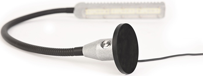 Hochleistungs-LED im Aluminiumgehäuse, mit Flexwelle und gummiummanteltem Magnetfuß · blend- und flackerfrei · gleichmäßige, reflexionsarme 105° Ausleuchtung, 90x70cm Lichtkegel bei 40cm Entfernung · Gesamtlänge 850mm