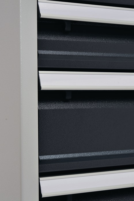 Gehäuse · Präzise Konstruktion aus hochwertigem Stahlblech · Gehäuse mit Rahmenverstärkung · Gesamttragfähigkeit 1500 kg Schubladen · Leichtgängige Schubladenführungen für maximalen Komfort mit 100 % Vollauszug · mit absoluter Einzelauszugsperre und Zentralverschluss, ein Kippen des Schrankes nach vorne ist ausgeschlossen · Innen liegende Aluminium-Griffleisten vermindern die Verletzungsgefahr durch hängenbleiben · Optimale Kennzeichnung durch Beschriftungsstreifen mit Klarsichtabdeckung · Geschlitzte Seitenwände bieten zahlreiche Möglichkeiten für individuelle Unterteilungen Lackierung · Alle Schubladenschränke werden mit einer hochwertigen und robusten Pulverbeschichtung (Strukturlack) geliefert