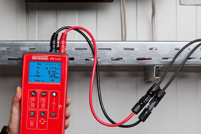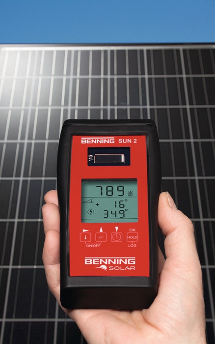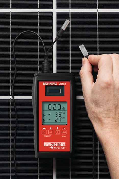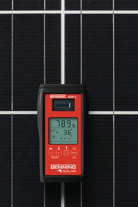 PV 1-1+ Photovoltaik-Instalationstester · geeignet für Inbetriebnahme-, Wiederholungsprüfung und Fehlersuche von PV-Systemen Anwendungsbereich: aufgrund der zusätzlichen Kapazität können diese PV-Module im Kurzschlussfall Einschaltströme erzeugen, die weit über den spezifizierten Kurzschlussströmen (Isc) liegen · automatischer Prüfablauf zur Messung der Leerlaufspannung, des Kurzschlussstromes und des Isolationswiderstandes · Niederohmmessung von Schutzleiter- und Potentialausgleichsleiterverbindungen · Betriebsstrommessung und Funktionsprüfung über Stromzangenadapter BENNING CC 3 · Funkanbindung zum Einstrahlungs- und Temperaturmessgerät BENNING SUN 2 · Messwertspeicher, USB-Schnittstelle und Downloadsoftware BENNING Solar Datalogger Vorteile Benning PV 1-1+ - verbesserte Prüfkompatibilität von PV-Modulen der neusten Technologie mit hohen Wirkungsgraden - optimierter Überlastschutz bietet einen 300 % höheren Schutz gegen transiente Kurzschlussströme verursacht durch hohe Modulkapazitäten - modifiziertes Gehäuse mit umlaufenden Gummischutz ermöglicht die Befestigung eines Tragegurtes für handfreies Arbeiten SUN 2 Einstrahlungs- und Temperaturmessgerät BENNING SUN 2 mit integriertem Digitalkompass zur Dachausrichtungs- und Neigungsmessung Anwendungsbereich: ideal zur Planung, Inbetriebnahme- und Wiederholungsprüfung von netzgekoppelten PV-Systemen gemäß VDE 0126-23 sowie zur Prüfung Universelles 4-in-1 Messgerät für alle Prüfungs- und Wartungsarbeiten sowie zur Wirtschaftlichkeitskontrolle von PV-Systemen und thermischen Solaranlagen - Kalibrierte Photovoltaik-Referenzzelle zur präzisen Messung der solaren Einstrahlung (Bestahlungsstärke) - genaue und reproduzierbare Temperaturmessung über Präzisionssensoren - bei Funkübertragung (433 MHz) zu Benning PV 1-1+ werden die aktuellen Einstrahlungs- und Temperaturwerte zum Messergebnis gespeichert - Datenlogger-Funktion mit einstellbarer Abtastrate (1 Min. bis 60 Min.) zur Speicherung von 5.000 Datensätzen, bestehend aus Bestrahlungsstärke, Modul-/Umgebeungstemperatur und Datum-/Zeitstempel - intergierte Echtzeituhr - USB Scchnittstelle und Download-Software zur Prüfprotokollerstellung in MS Excel® - HOLD-Funktion zur Displayspeicherung - Display umschaltbar - stromsparender Bereitschaftsmodus im Datenloggerbetrieb - handliche und robuste Gehäuseausführung Messfunktion: Messung der solaren Einstrahlung (W/m2) - 2-Kanal-temperatursensor zur Messung der Modul- und Umgebungstemperatur (°C) - digitaler Kompass zur Bestimmung der Himmelsrichtung - Neigungswinkelmesser zur Bestimmung der Dach-/Modulneigung