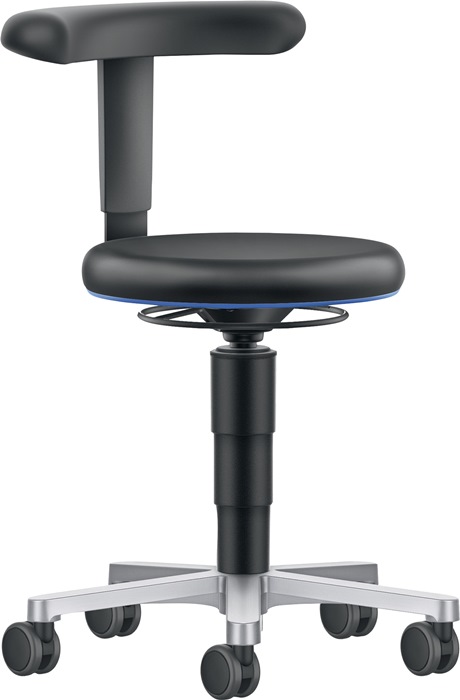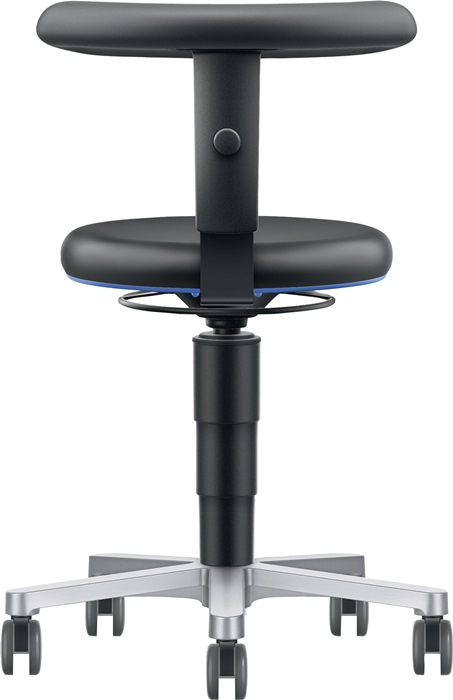 nach DIN 68877 · bedienungsfreundliche Gasfeder-Sitzhöhenverstellung mit umlaufender Ringauslösung · blaue Ringabdeckung zum Schutz der Polster · abgerundetes Kunstlederpolster Ø 400 mm, abwaschbar, desinfektionsmittelbeständig, weich und bequem · dicke Polsterung für ein komfortables Sitzgefühl · kompaktes Fünffuß-Untergestell aus poliertem Aluminium Ø 500 mm, hygienisch und einfach zu reinigen Untergestell mit extra großen weiche Universalrollen Ø 65 mm für leichtgängiges Rollen über alle Böden