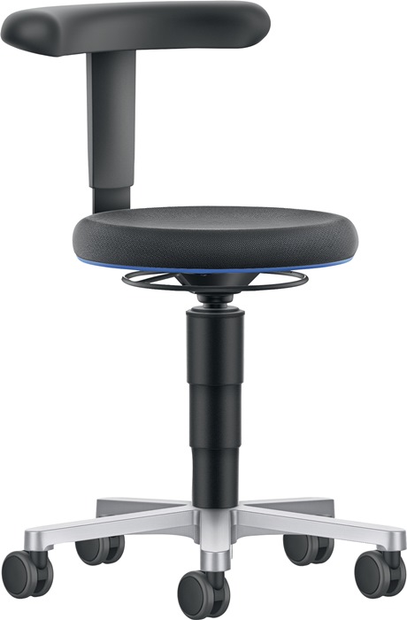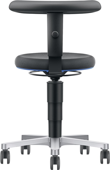 nach DIN 68877 · bedienungsfreundliche Gasfeder-Sitzhöhenverstellung mit umlaufender Ringauslösung · blaue Ringabdeckung zum Schutz der Polster · abgerundetes Supertec-Gewebepolster Ø 400 mm, komfortabel, atmungsaktiv, sehr widerstandsfähig durch Mikropanzerung, schnittfest, rutschfest, reinigungsfreundlich · dicke Polsterung für ein komfortables Sitzgefühl · kompaktes Fünffuß-Untergestell aus poliertem Aluminium Ø 500 mm, hygienisch und einfach zu reinigen Untergestell mit extra großen weiche Universalrollen Ø 65 mm für leichtgängiges Rollen über alle Böden