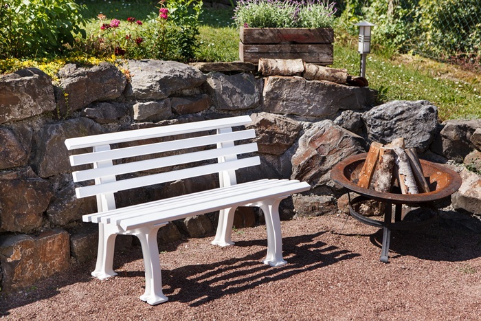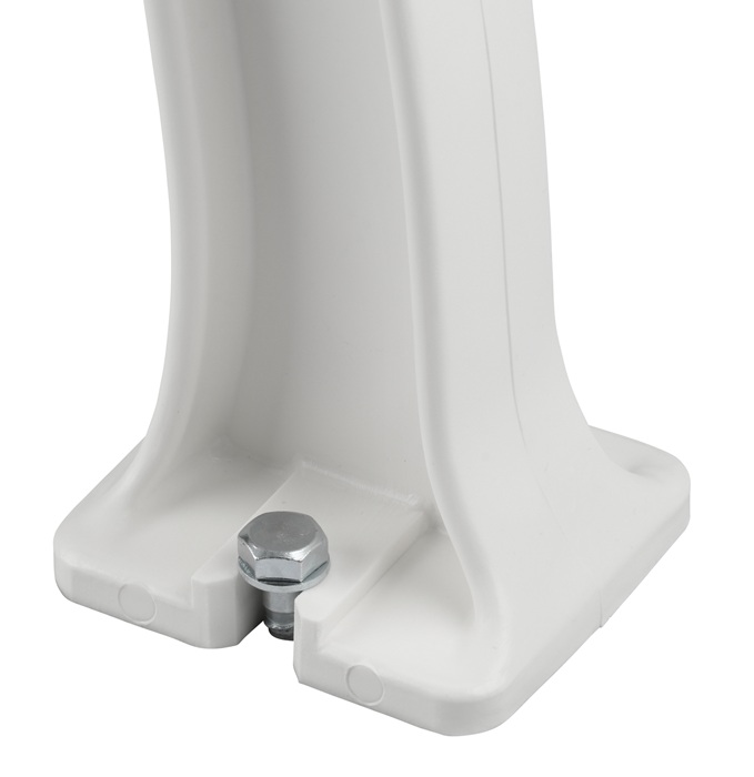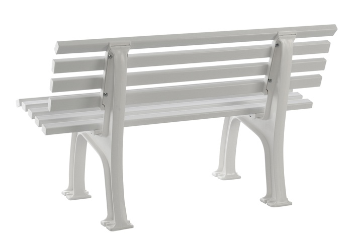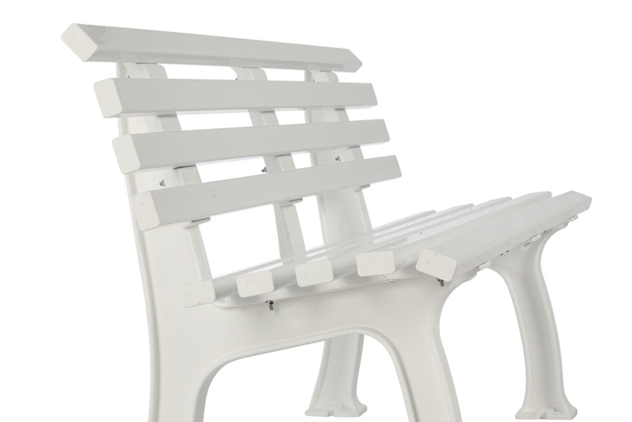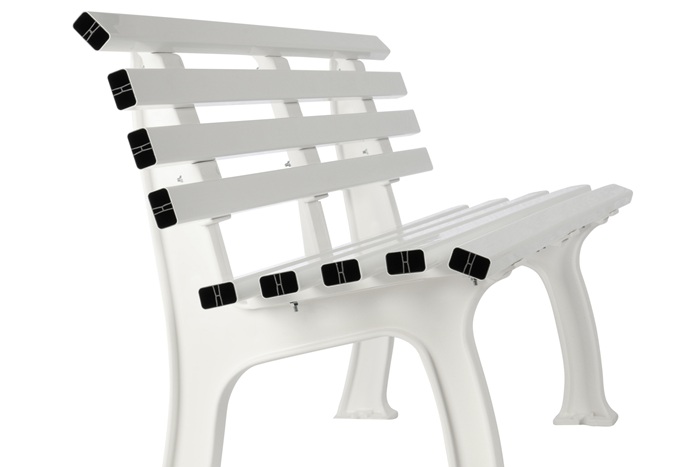 aus UV- und witterungsbeständigem Kunststoff · Füße aus Polypropylen · Sitzhöhe 44 cm · Sitztiefe 38 cm · Sitz- und Rückenleisten aus PVC-Mehrkammerprofilen (50 x 30 mm), 9 Leisten · zur Bodenbefestigung (Befestigungsmaterial nicht inklusive) · teilmontierte Anlieferung