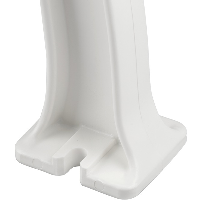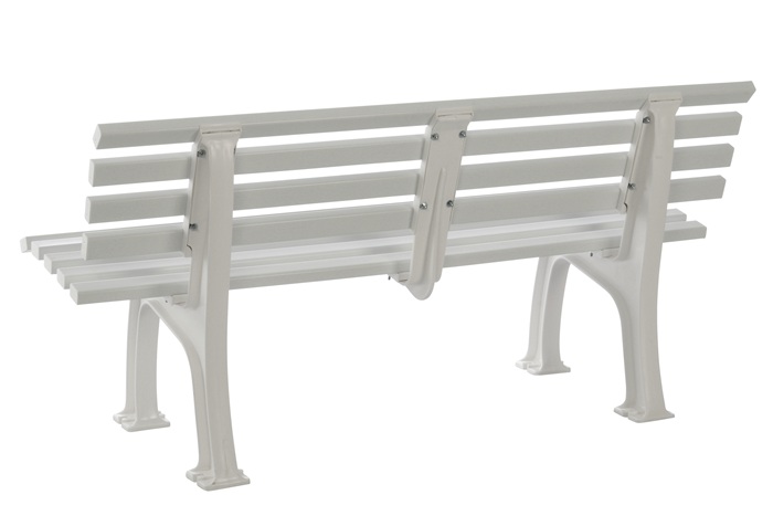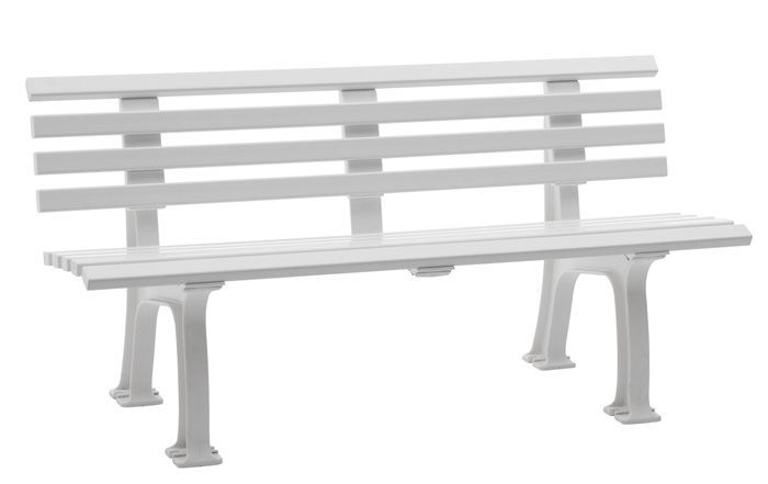 aus UV- und witterungsbeständigem Kunststoff · Füße aus Polypropylen · Sitzhöhe 44 cm · Sitztiefe 38 cm · Sitz- und Rückenleisten aus PVC-Mehrkammerprofilen (50 x 30 mm), 9 Leisten · zur Bodenbefestigung (Befestigungsmaterial nicht inklusive) · teilmontierte Anlieferung