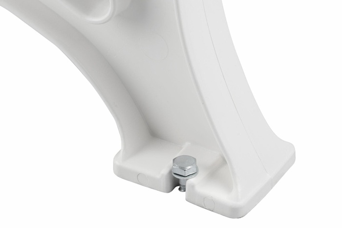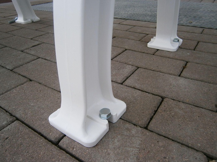 aus UV- und witterungsbeständigem Kunststoff · Füße aus Polypropylen · Sitzhöhe 44 cm · Sitztiefe 38 cm · Sitz- und Rückenleisten aus PVC-Mehrkammerprofilen (50 x 30 mm), 9 Leisten · zur Bodenbefestigung (Befestigungsmaterial nicht inklusive) · teilmontierte Anlieferung