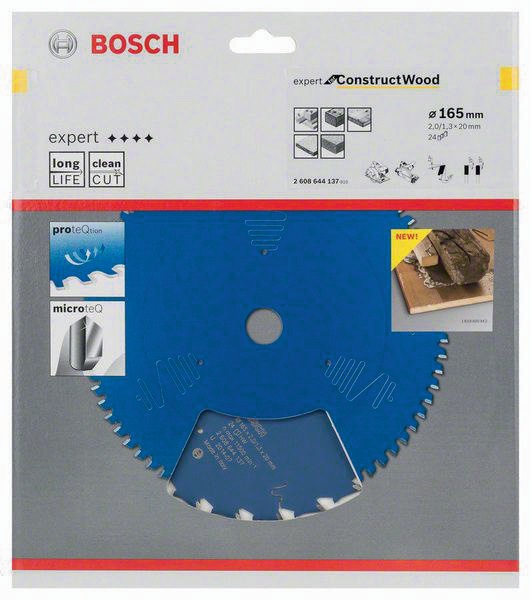 Expert for Construct Wood für Tauch- und Handkreissägen · das spezielle Zahndesign und die breite Abstützung im Zahnrücken sorgen für eine hohe Widerstandskraft und schneiden Baustellenholz mit Fremdkörpern wie Nägel und Betonreste · auch geeignet zum Schneiden von Schalungsbrettern · rohen Spanplatten · Akustikplatten · Leichtbauplatten sowie Gasbeton · Zähne aus Microteq für hohe Lebensdauer