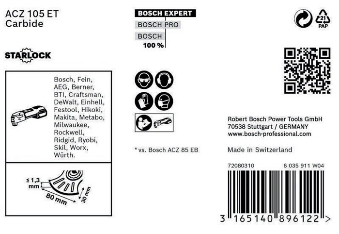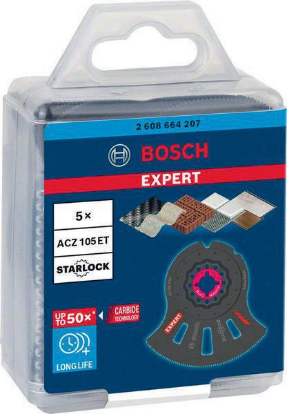 lange Lebensdauer beim Schneiden von abrasivem Material und Verbundwerkstoffen · breiter Körper und große Krümmung der Carbide-Zähne · mit Bosch Carbide Technology · extrem harte Zahnleiste schneidet die härtesten und abrasivsten Materialien · Starlock Aufnahme für maximale Kraftübertragung und bequemen Klingenwechsel