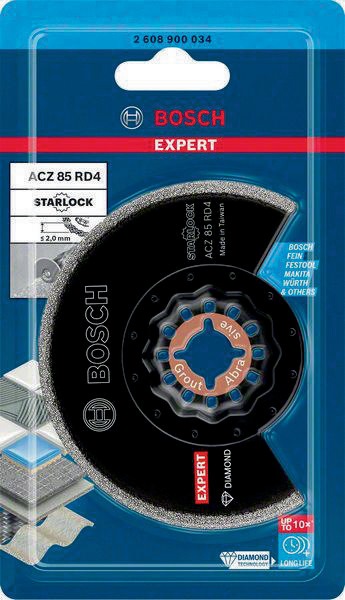 die Bosch Diamond Technology bietet eine feine Schneidekante aus hochwertigen Diamantkörnern, die maximale Verschleißfestigkeit in hartem Mörtel bieten · es kann auch für kleine Anpassungsschnitte in weichen Fliesen genutzt werden · Starlock Aufnahme für maximale Kraftübertragung