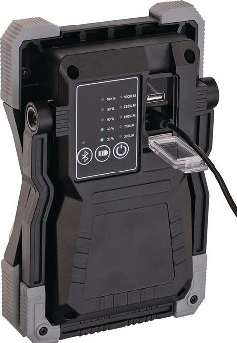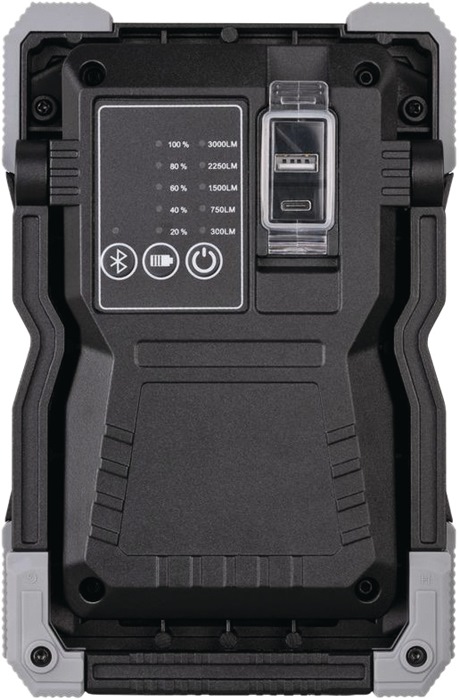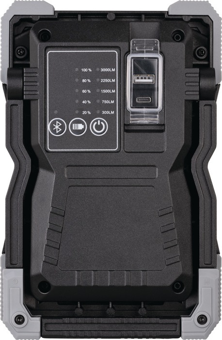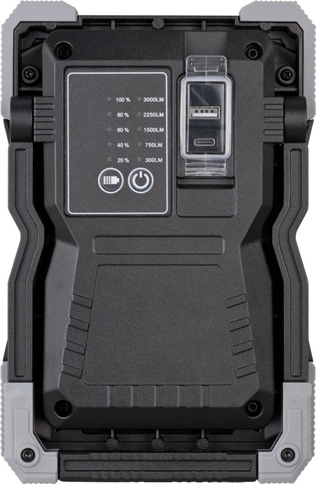 3000 lm · Schutzart IP65 · Li-lon Akku 7,4 V/5 Ah mit Powerbank-Funktion und Ladeanzeige · Schalter mit Funktionen: Licht: 100 % - 75 % - 50 % - 25 % - 10 % · USB-Ladekabel Eingang Typ A / Ausgang Typ C · Powerbank-Funktion: USB-Ladeanschluss 1 A für Geräte mit USB-Ladekabel wie Smartphones, Tablets, etc. · Gehäuse aus Aludruckguss, Kantenschutz aus hochwertigem Kunststoff · stoßfest und sturzsicher aus bis zu 3 m Höhe · stabiles, mehrstufig ausklappbares Gestell · mit passender robuster Tasche für den sicheren Transport