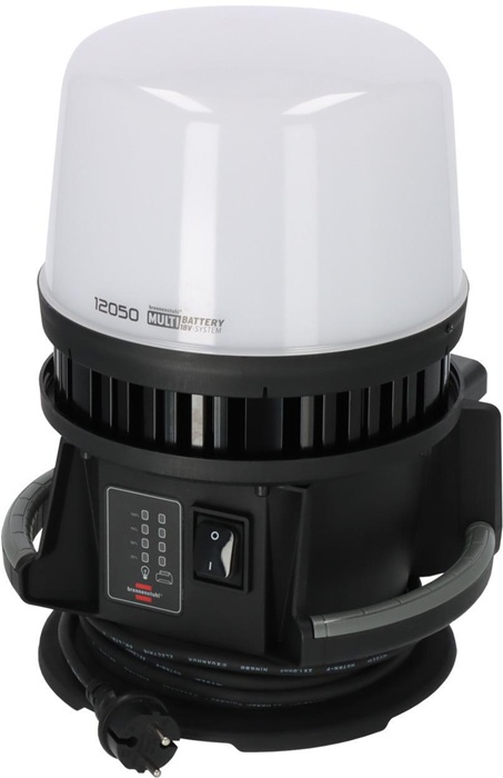 leuchtstarker Multi Battery LED 360° Hybrid Baustrahler · staub- und spritzwassergeschützt · kompatibel zu elf 18V Akku-Systemen der Powertool-Hersteller: Bosch Professional, Dewalt, Einhell, Fein, Festool, Flex, Hikoki, Makita, Metabo CAS, Milwaukee und Würth · Ein/Aus Schalter, über welchen man zudem die 4 Schaltstufen (100% - 75% - 50% - 25% Licht) steuert · Hybrid-Technik: Netz und Akku Betrieb möglich · mit fest installiertem 5 m Kabel (H07RN-F2X1,0) · Akku-Zustandsanzeige · Kabelaufwicklung · Haken zum Aufhängen · flexible Nutzung: stehend, hängend, auf Stativ montierbar · Leuchtdauer in Abhängigkeit des verwendeten Akkus: ca. 12 min/1Ah bei 100% Lichtleistung, ca. 16 min/1Ah bei 75% Lichtleistung, ca. 24 min/1Ah bei 50% Lichtleistung, ca. 48 min/1Ah bei 25% Lichtleistung · Farbtemperatur: 6500K · Schutzart: IP54 · Schlagfestigkeit: IK08