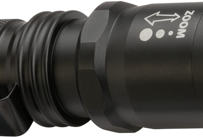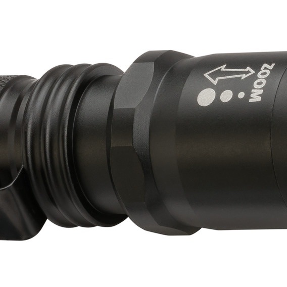 spritzwassergeschützt · Aluminiumgehäuse · Fokusfunktion · 3 Leuchtstufen: 100% - 50% - Stroboskop