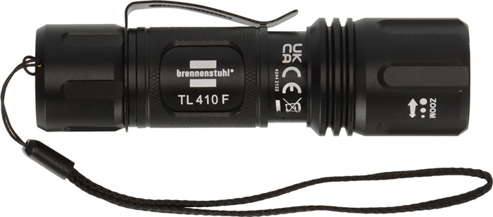 spritzwassergeschützt · Aluminiumgehäuse · Fokusfunktion · 3 Leuchtstufen: 100% - 50% - Stroboskop