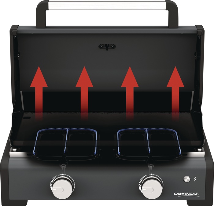 Tischgerät · mit 2 Blue Flame Edelstahlbrennern für eine gleichmäßige Hitzeverteilung auf der gesamten Grillfläche · elektronische Zündung · emaillierte gusseiserne Kontaktgrillplatte · Grillfläche ca. 2.088 cm² · Leistung 6 kW · indirektes Grillen durch Kombination mit Plancha-Kochdeckel mit integriertem Thermometer · 2-mal schnelleres Vorheizen der Plancha = reduzierter CO² Fußabdruck · verbessertes Reinigungssystem: über das in der Plancha-Platte integrierte Abschlussloch können Speisereste, Fett und Flüssigkeiten durch einen Trichter direkt in den Fettauffangbecher laufen · inkl. Abdeckhaube