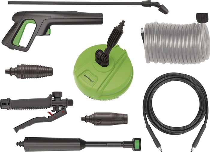 Kaltwasser · 3-Stufen-Drehschalter · Total Stopp-Pumpensteuerung über einen Druckschalter durch Öffnen und Schließen der Pistole · Reinigungsmittelbehälter · automatisches Sicherheitsventil · Drei-Kolben-Axialpumpe mit Taumelscheibe und Aluminiumkopf · Kolben aus Edelstahl · Zubehörhalterungen am Gerät