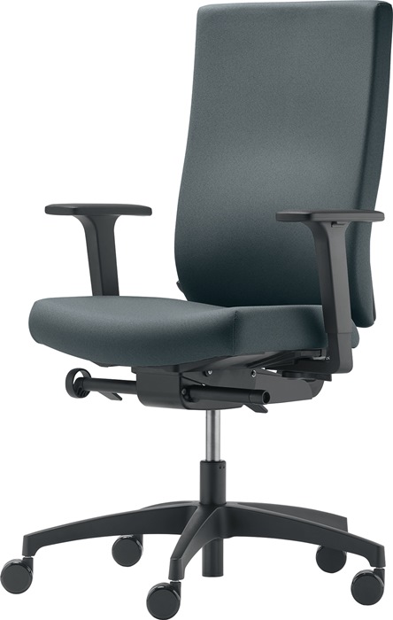 mit Synchrontechnik (mit Armlehnen) · für überwiegend sitzende Tätigkeiten · stabiles Kunststofffußkreuz, schwarz · hohe Polsterrückenlehne · Armlehnen höhen- und breitenverstellbar, mit PU-Auflage · seitliche Einstellung des Rücklehnengegendrucks im Sitzen mittels Handrad · Polster 100 % Polyester · Sitzfläche B 470 x T 380-440 mm · Sitztiefenverstellung 60 mm mittels Schiebesitz · Lehnenhöhe 610-680 mm · Universalrollen für weiche und harte Böden Lieferung erfolgt zerlegt