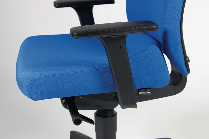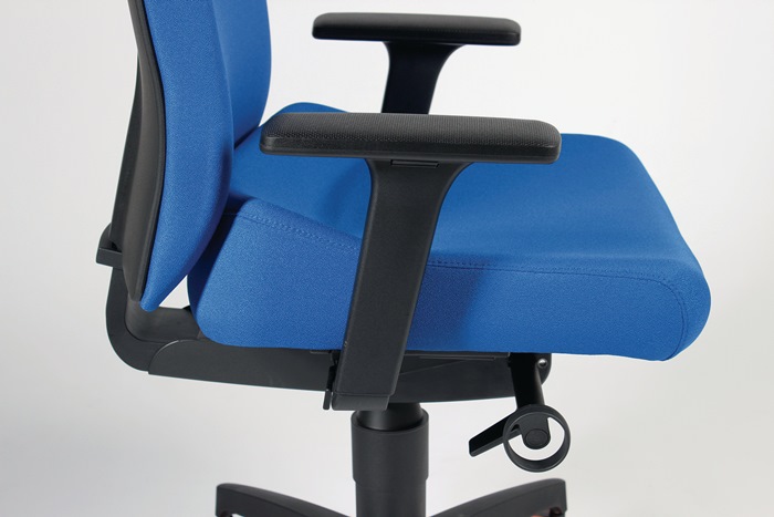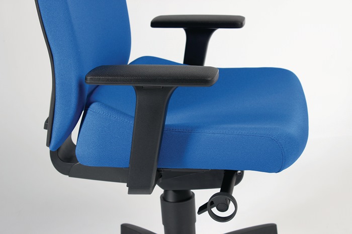 mit Synchrontechnik (mit Armlehnen) · für überwiegend sitzende Tätigkeiten · stabiles Kunststofffußkreuz, schwarz · seitliche Einstellung des Rückenlehnengegendrucks im Sitzen mittels Handrad · hohe Polsterrückenlehne · Armlehnen höhen- und breitenverstellbar, mit PU-Auflage · spezieller Bandscheibensitz für eine ergonomische Sitzposition und eine perfekte Druckverteilung · Polster 100 % Polyester · Sitzfläche B 470 x T 380 mm · Lehnenhöhe 610-680 mm · Universallrollen für weiche und harte Böden Lieferung erfolgt zerlegt