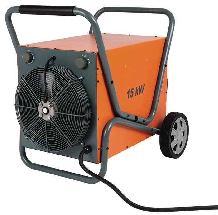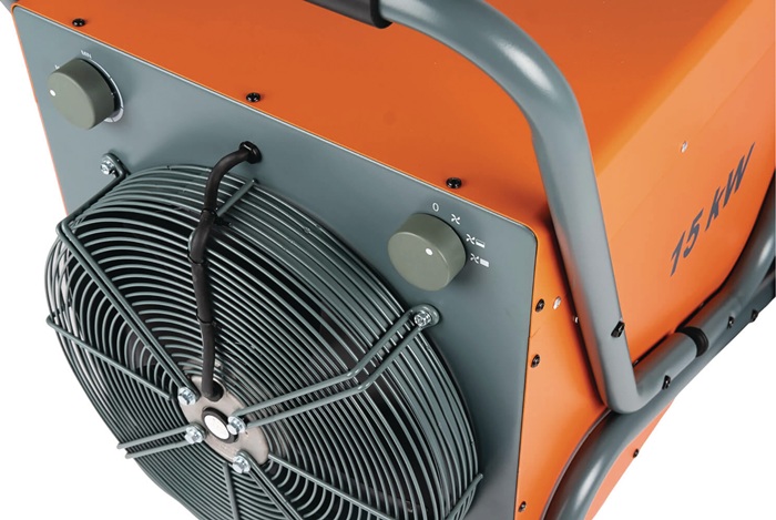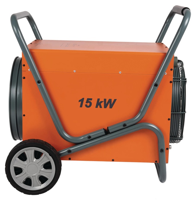 15000 W · robustes Gehäuse · Luftverdrängung von 1950 m3 pro Stunde · mit Kaltluftventilator und Thermostat · spritzwassergeschützt · mit Nachkühlfunktion und Überhitzungsschutz