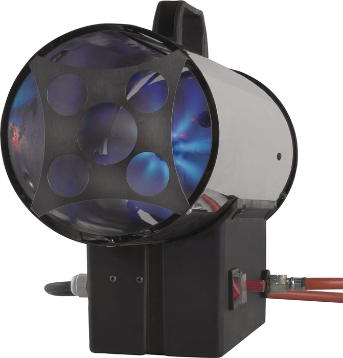 Heißluftpistole · Leistung von 10 kW · Luftverdrängung von 300 m³ pro Stunde dafür · für Räume bis zu 350 m³ · verwendet Sauerstoff zur Verbrennung · sehr hohen Wirkungsgrad von fast 100% · eine gute Belüftung ist wichtig · mit Schlauch und Regler geliefert