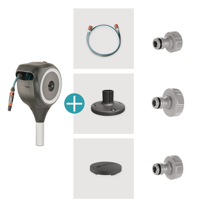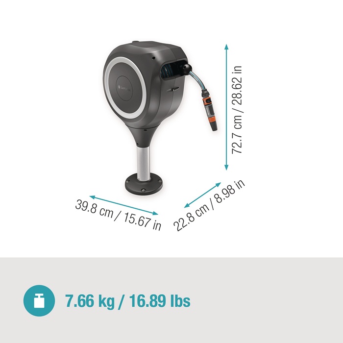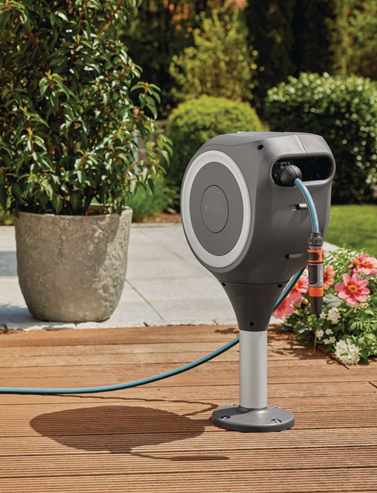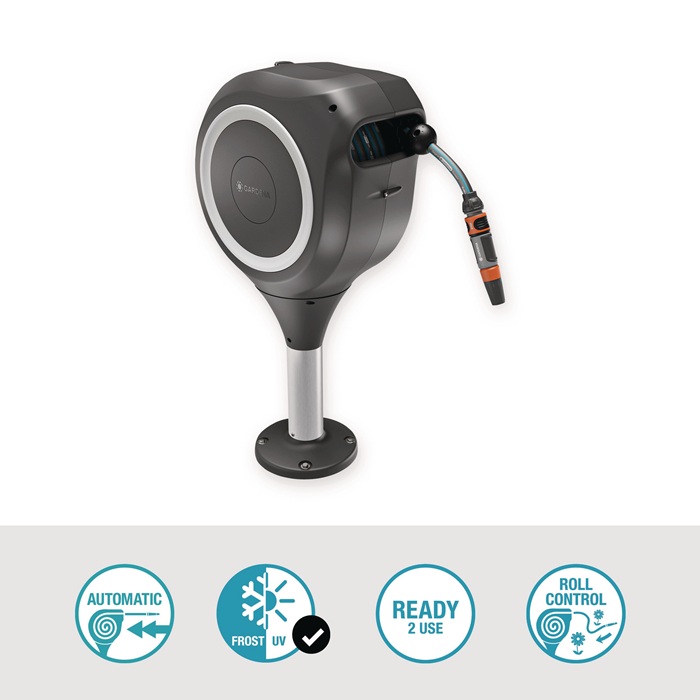 RollUp-Technologie (Stahlantriebsfeder) sorgt für ein einfaches Ausrollen und bequemes Aufrollen ohne Verwicklungen · wetterfest: mit UV- und Frostschutz · zur Montage direkt auf Holz- oder Betonböden - um 360° drehbar, ohne dass der Schlauch dabei geknickt wird
