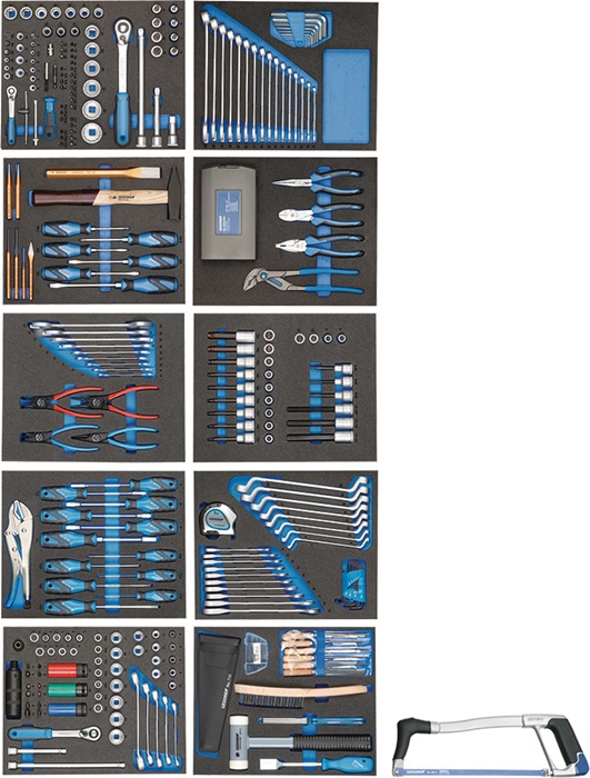 308-teiliges Sortiment für Industrie, Handwerk und Automotive Werkzeuge in metrischen Abmessungen GEDORE Check-Tool-System: Vollständigkeitsprüfung durch 2-farbige Schaumstoffeinlagen Im Werkzeugwagen WSL-L7 aus pulverbeschichtetem Stahlblech Korpus: · Maße: H 1045 x B 785 x T 510 mm · Arbeitsplattform mit Abdeckung aus PP-Kunststoff mit frontaler Abflachung und Rollschutzkante, sowie kleinen zusätzlichen Ablagefächern · Seitenwände mit Euro-Lochung 10 x 38 mm · Korpus verschweißt, selbsttragend und verwindungssteif Schubladen: · Einzelauszugssperre verhindert das Öffnen von mehr als einer Schublade, · Zentralverriegelung mit Zylinderschloss · 7 Schubladen (B 640 x T 400 mm) mit Vollauszug · kugelgelagerte Führungsschienen Fahrwerk: · Gesamttragkraft 400 kg · 4 kugelgelagerte Leichtlaufräder mit Fadenschutz, eine mit Totalfeststeller