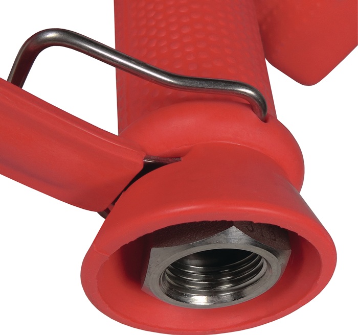 für Reinigungszwecke bei andauernden Heißwasseranwendungen in Industrie, Gewerbe, Werkstatt und Lebensmittelindustrie · verstärkter Sicherheitsbügel · rote Gummiummantelung dient zum Schutz gegen Beschädigungen, sowie Kälte- und Wärmeweiterleitung des durchfließenden Wassers · stufenlose Regulierung der Strahlstärke, leichte Handhabung durch Einhandbetrieb, arretierbar · Strahlform mittels Münze einstellbar · wasserführende Metallteile aus Edelstahl 1.4401 · Gummiummantelung aus EPDM · Betriebsdruck max. 24 bar · Temperatureinsatzbereich max. 95 °C · Reinigungspistole ist nicht für Dampf geeignet! · Dichtung: FKM (Fluorkautschuk) nach DIN ISO 1629, Teflon/Luft isoliert
