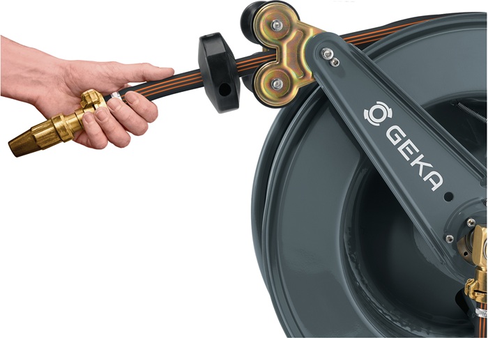 GEKA® plus Automatischer Schlauchaufroller · pulverbeschichtete Stahlkonstruktion · automatischer Rückzug des Schlauchs · für Wand-, Boden- und Deckenmontage · fertig montiert und sofort einsatzbereit · schwenkbare Wandhalterung separat erhältlich Material: Gehäuse: pulverbeschichteter Stahl Abmessungen: 61 x 33 x 53 cm