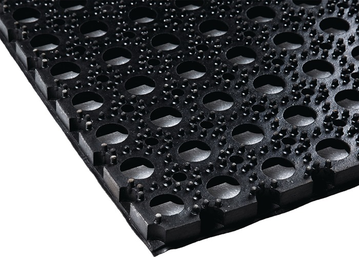 vielseitig einsetzbar für den Innen- und Außenbereich · u. a. als Fußmatte/Schmutzmatte anwendbar · offene Struktur · abriebfest · witterungsbeständig · sehr hohe Drainagefunktion · Zugfestigkeit 3.0 MPa · Bruchdehnung 200 % Qualität: NR/SBR Härte: 70 +/-5° Shore A Einsatztemperatur: -10 bis +70 °C Unterseite: genoppt Farbe: schwarz
