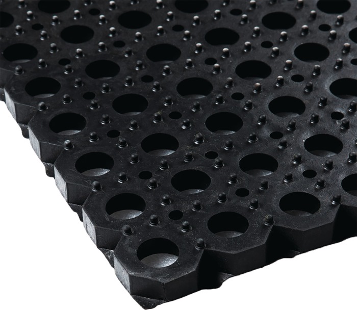 schwere Ausführung · vielseitig einsetzbar für den Innen- und Außenbereich · u. a. als Fußmatte/Schmutzmatte anwendbar · ausgestattet mit Wabenstruktur · abriebfest · witterungsbeständig · Schwerlast · Zugfestigkeit 3.0 MPa · Bruchdehnung 200 % Qualität: NR/SBR Härte: 70 +/-5° Shore A Einsatztemperatur: -10 bis +70°C Unterseite: leicht genoppt Farbe: schwarz