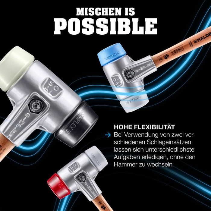 extra leichtes Aluminium-Gehäuse mit integrierter Stielschutzhülse - ideal für bruchempfindliche Materialien · Schlageinsätze und Simplex-Stiel sind leicht auswechselbar durch Lösen bzw. Spannen der Innensechskant-Spannschraube · hochwertiger, schwingungsdämpfender, ergonomisch geformter Holzstiel, Griffbereich doppelt lackiert (schmutzunempfindlich) · mit je 1 Stück Schlageinsatz aus TPE-soft, blau (weich), und TPE-mid, grau (mittelhart)