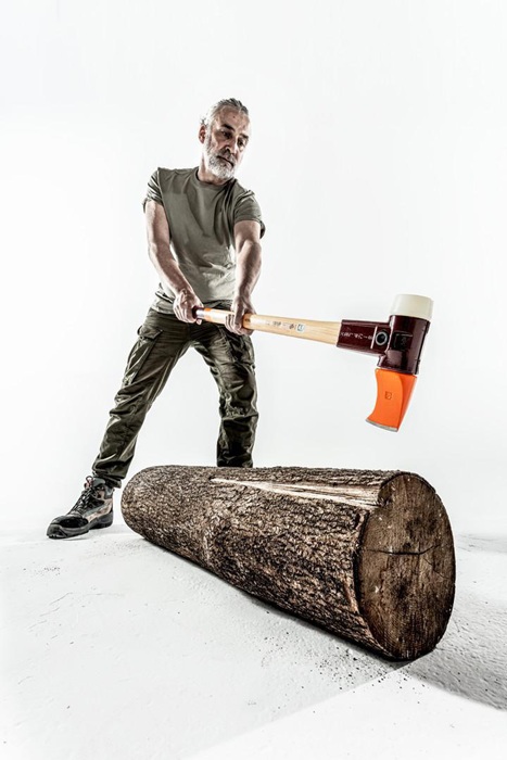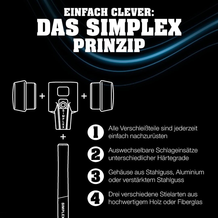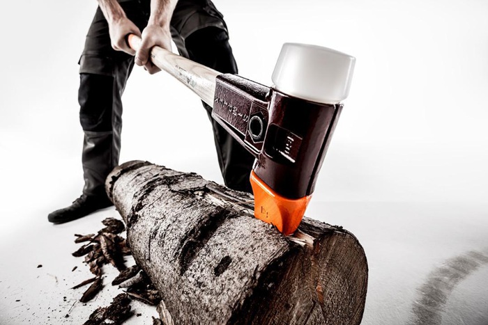 Spalthammer und Schonhammer in einem · zweiteiliges Gehäuse und Temperguss · massive Stielschutzhülse · ergonomisch geformt · gesenkgeschmiedeter und vergüteter Spalteinsatz mit Wendenase aus Carbonstahl · Schlageinsatz aus Nylon weiß hart, 60 mm · alle Ersatzteile auswechselbar · Ersatz-Nylon-Einsatz siehe Art.-Nr. 4000 811 683