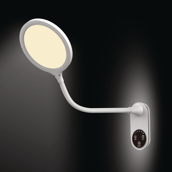 ABS/Silikon · mit Standfuß und zur Wandmontage geeignet · 3-Stufen-Dimmer · mit flexiblem Schwanenhalsarm · Armlänge 300 mm - Höhe 390 mm · Lichtfarbe 2.800 – 5.700Kelvin – warmweiß - tageslichtweiß · Lichtstrom 530 Lumen ∙ Lebensdauer 30.000 Stunden · Effizienzklasse F (Spektrum A bis G) · gewichteter Energieverbrauch 9kWh/1000h ∙ diese Leuchte enthält eingebaute LED-Lampen · die Lampen können nicht ausgetauscht werden
