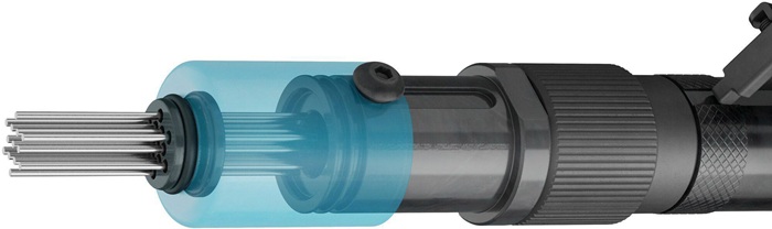 schonende Reinigung von verschmutzten und verrosteten Teilen insbesondere Reinigung von Bremsanlagen usw. · verstellbarer Nadelschlitten mit integrierter Nadelführung gewährleistet lange Standzeiten · 13 dünne Edelstahl Nadeln (Ø 1,3 mm) sorgen für beschädigungsfreie Bearbeitung sowie eine hochfeine Oberflächenstruktur · 28 mm schlanke, kurze Stiftform und freie Nadeln ermöglichen auch das Erreichen verwinkelter Bereiche · geeignet zur Bearbeitung von Edelstahl · 3000 Schläge/min · 360° verstellbarer Luftauslass · Sicherheitsauslösehebel · stufenlos einstellbare Leistung