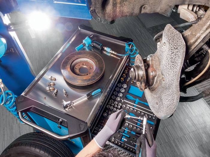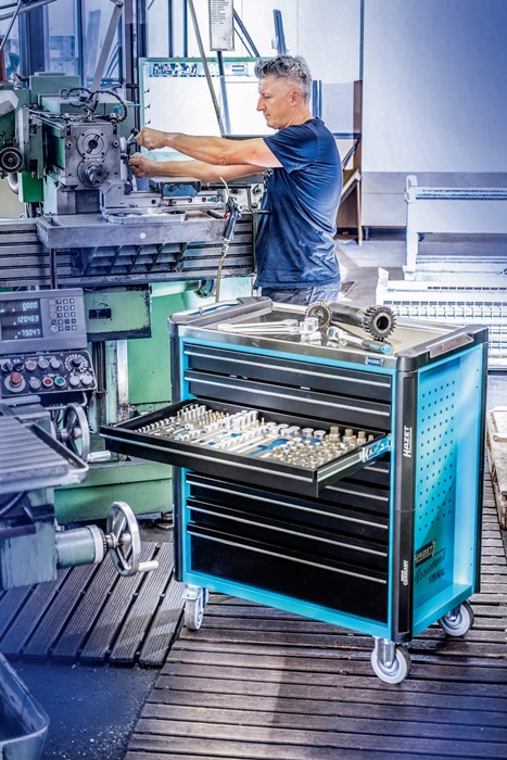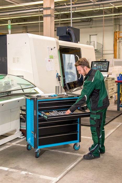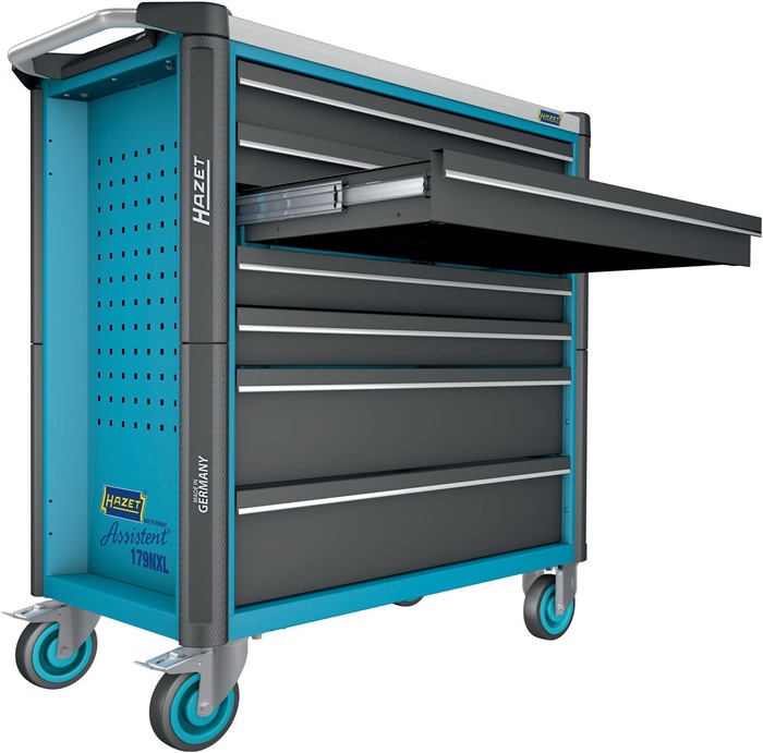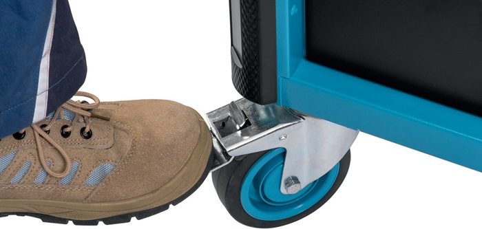 komplett mit 440-teiligem Werkzeug Sortiment in Safety-Insert-System Weichschaumeinlage · extrem robuste Ausführung durch doppelwandige Schweißkonstruktion des gesamten Korpus · 8 Schubladen mit Selbsteinzug und 100 % Auszug mit kugelgelagerten Teleskop-Schienen · Schubladen, flach: 7× 81 x 696 x 398 mm - Schubladen, hoch: 1× 166 x 696 x 398 mm · Schubladendesign zur optimalen Nutzung des Innenraums Schubladenfronten für optimiertes Handling · Edelstahl-Arbeitsfläche, ergonomischer Fahrgriff aus gebürstetem Edelstahl · optimierter, nachgebender Kantenschutz an allen vier Ecken mit echtem Aufprallschutz durch innenliegendes Dämpfungskonzept · seitliche Schlossposition · Zentral-Verschlusstechnik, 2-stufige Verriegelung: Zentralverriegelung, abschließbar durch Zylinderschloss mit 2 Knickschlüsseln · Hochleistungsfahrwerk · 2 Lenkrollen mit Doppelstopp · Räder mit Präzisionskugellager und 2-fachem Kugelkranz im Schwenklager - einfaches Bewegen auch bei hoher dynamischer Last · ruhiger Lauf dank Fäden Elastikrollen · abgedichtete Arbeitsfläche schützt Wageninneres bei auslaufenden Flüssigkeiten · Gesamttragkraft (dynamisch): 750 kg · Gesamttragkraft (statisch): 1000 kg · Traglast hohe Schublade: 40 kg Schubladengröße für Ordnungssystem: 4/3+ Anzahl Bockrollen: 2 (∅ 125 mm) Anzahl Lenkrollen: 2 (∅ 125 mm) Anzahl Werkzeuge: 440 Abmessungen / Länge: 959 mm x 518 mm x 1020 mm Netto-Gewicht (kg): 125 kg