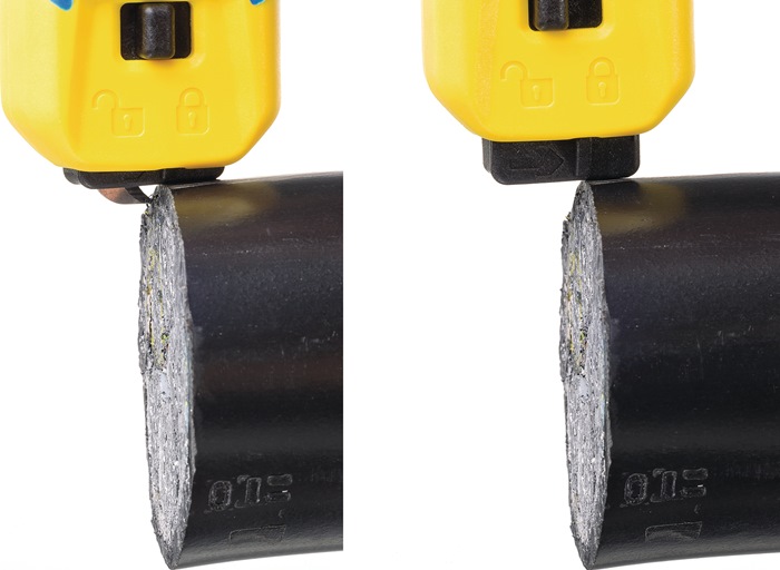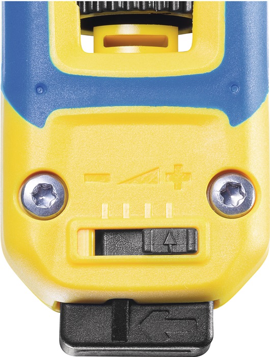 für Wechselbügelsystem zum Abisolieren aller gängigen Rundkabel · Wechselbügel austauschbar · mit automatischem Klingenschutz der Hakenklinge · Schnitttiefe der Klingen einstellbar · ausgeliefert mit 2 Bügeln: 8 - 35 mm ø 6/16" - 1.1/2" ø · Klingen Titan-Nitrid beschichtet, dadurch höhere Schnittgeschwindigkeit, geringerer Verschleiß, höhere Standzeit · Ersatzmesser im Gehäuse