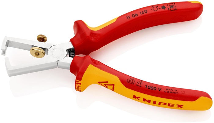 VDE-isoliert bis 1000 V · gefertigt gem. DIN EN/IEC 60900, stückgeprüft · mit Rändelschraube und Kontermutter · mit Mess-Skala für Abisolierlänge · Öffnungsfeder · Spezial-Werkzeugstahl, ölgehärtet und angelassen Zange verchromt