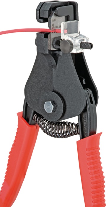 mit Formmessern · formschlüssiges Abisolieren auch von schwer zu entfernenden Isolierwerkstoffen aus PTFE, Silikon, Radox®, Kapton® und Gummi, auch mehrlagig · mit einstellbarem Längenanschlag für gleiche Abisolierlängen bei Serienarbeit · 4 auswechselbare Messer · Zangenkörper: Stahl · Messer: Spezial-Werkzeugstahl, ölgehärtet Zange brüniert