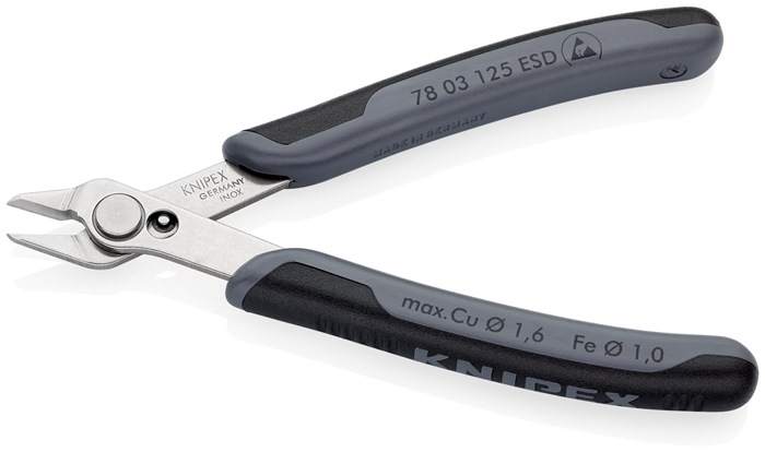 ESD · für feinste Schneidarbeiten z. B. in Elektronik und Feinmechanik · geschliffene, sehr scharfe Schneiden · Gelenk mit Edelstahl-Niet · Schneiden zusätzlich induktiv gehärtet · mit Öffnungsfeder und Öffnungsbegrenzung · Inox -Werkzeugstahl · elektrisch ableitend - dissipativ Kopf poliert