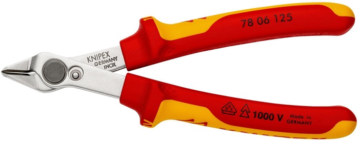 VDE-isoliert bis 1000 V · gefertigt gem. DIN EN/IEC 60900, stückgeprüft · für feinste Schneidarbeiten z. B. in Elektronik und Feinmechanik · geschliffene, sehr scharfe Schneiden · Gelenk mit Edelstahl-Niet · Schneiden zusätzlich induktiv gehärtet · mit Öffnungsfeder und Öffnungsbegrenzung · Inox Kopf poliert