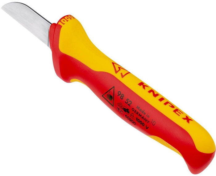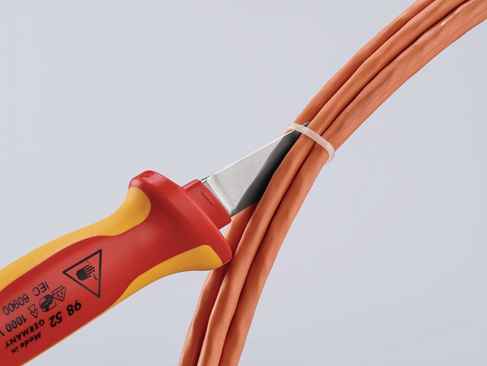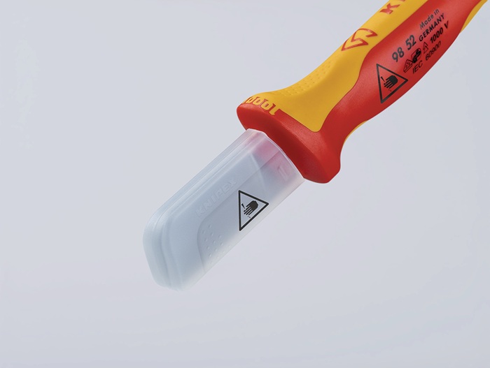 VDE-isoliert bis 1000 V · gefertigt gem. DIN EN/IEC 60900, stückgeprüft · stabile, feststehende Klinge mit gerader Schneide und transparenter Schutzkappe · Klinge: Spezial-Werkzeugstahl, ölgehärtet mit Mehrkomponentengriff