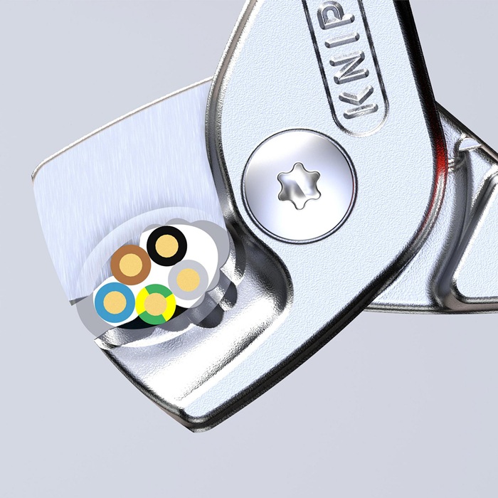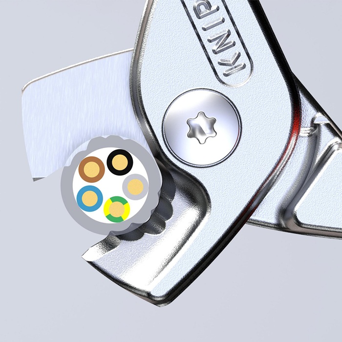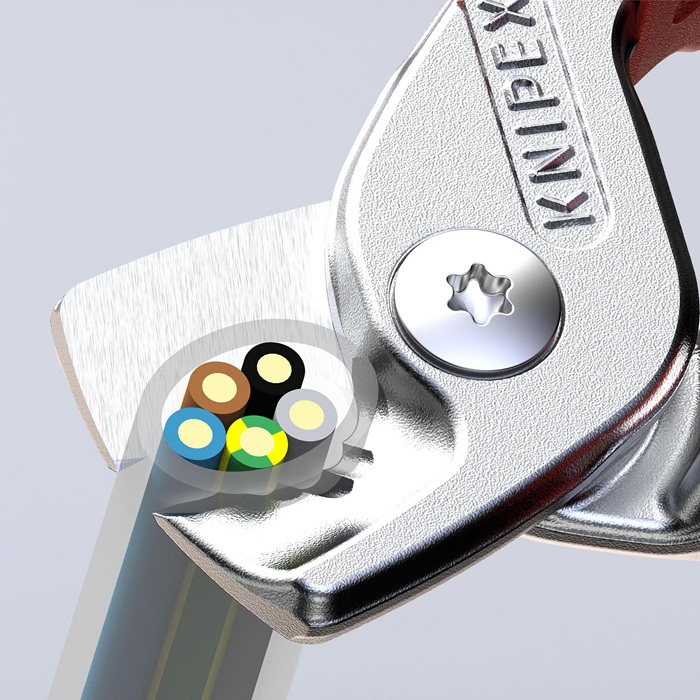 schneidet bis zu 40% leichter als Standard-Kabelscheren gleicher Länge · durchtrennt Adern oder Litzen durch abgestufte Klingen nacheinander · schneidet Cu- und Al-Mehrleiterkabel feinadrig bis Ø 15 mm (50 mm²) und massive Cu- und Al-Kabel bis 5 x 4 mm² · leichter, sauberer Schnitt ohne zu quetschen · gehärtete Schneiden mit Präzisionsschliff · Klemmschutz · nicht für Stahldraht und hartgezogene Kupferleiter geeignet · Spezial-Werkzeugstahl