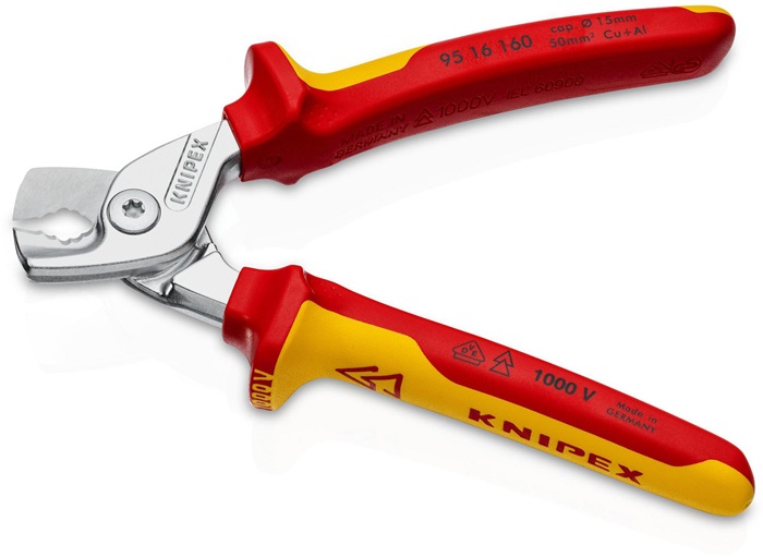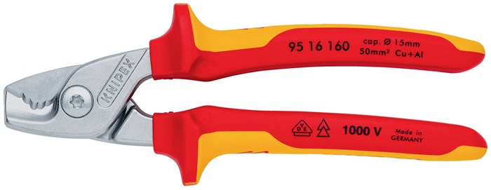 VDE-isoliert bis 1000 V · gefertigt gem. DIN EN/IEC 60900, stückgeprüft · schneidet bis zu 40% leichter als Standard-Kabelscheren gleicher Länge · durchtrennt Adern oder Litzen durch abgestufte Klingen nacheinander · schneidet Cu- und Al-Mehrleiterkabel feinadrig bis Ø 15 mm (50 mm²) und massive Cu- und Al-Kabel bis 5 x 4 mm² · leichter, sauberer Schnitt ohne zu quetschen · gehärtete Schneiden mit Präzisionsschliff · Klemmschutz · nicht für Stahldraht und hartgezogene Kupferleiter geeignet · Spezial-Werkzeugstahl