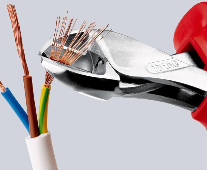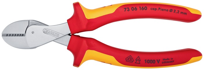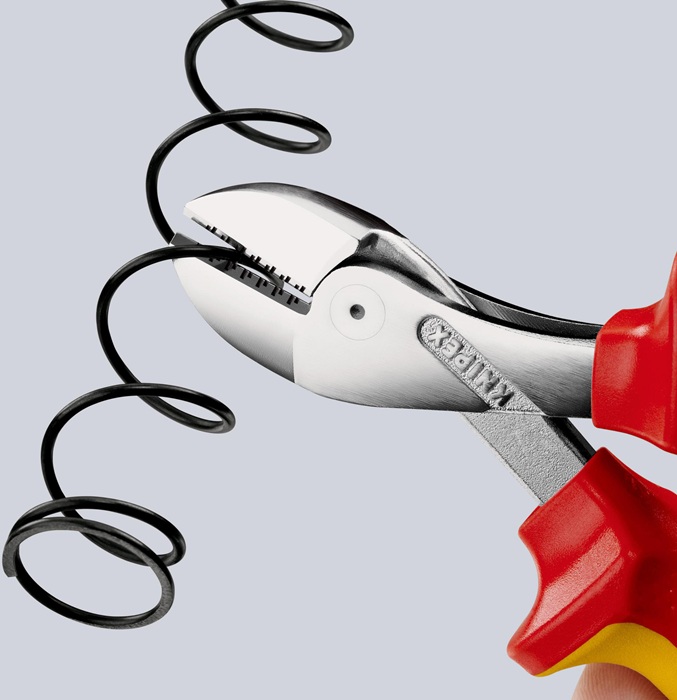 VDE-isoliert bis 1000 V · gefertigt gem. DIN EN/IEC 60900, stückgeprüft · 40 % Kraftersparnis gegenüber herkömmlichen Seitenschneider · doppelt gelagerte Gelenkachse · durchgestecktes Gelenk · für alle Drahtsorten einschließlich Pianodraht · auch für dünne Cu-Drähte · große Öffnungsweite für dickere Kabel · kompakte, gewichtssparende Bauweise · Chrom-Vanadin-Hochleistungsstahl, geschmiedet, mehrstufig ölgehärtet Zange verchromt
