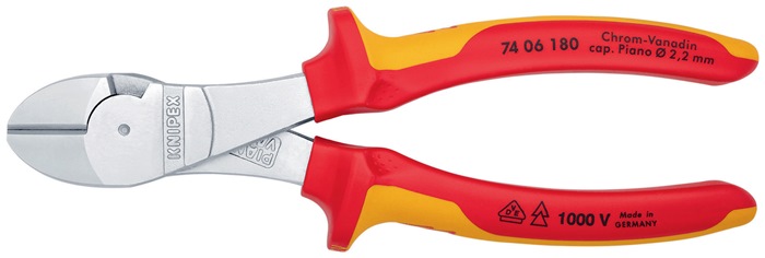 VDE-isoliert bis 1000 V · gefertigt gem. DIN EN/IEC 60900, stückgeprüft · 20 % Kraftersparnis gegenüber herkömmlichen Seitenschneider · Schneiden zusätzlich induktiv gehärtet, Schneidenhärte ca. 64 HRC · Chrom-Vanadin-Hochleistungsstahl, geschmiedet, mehrstufig ölgehärtet Zange verchromt